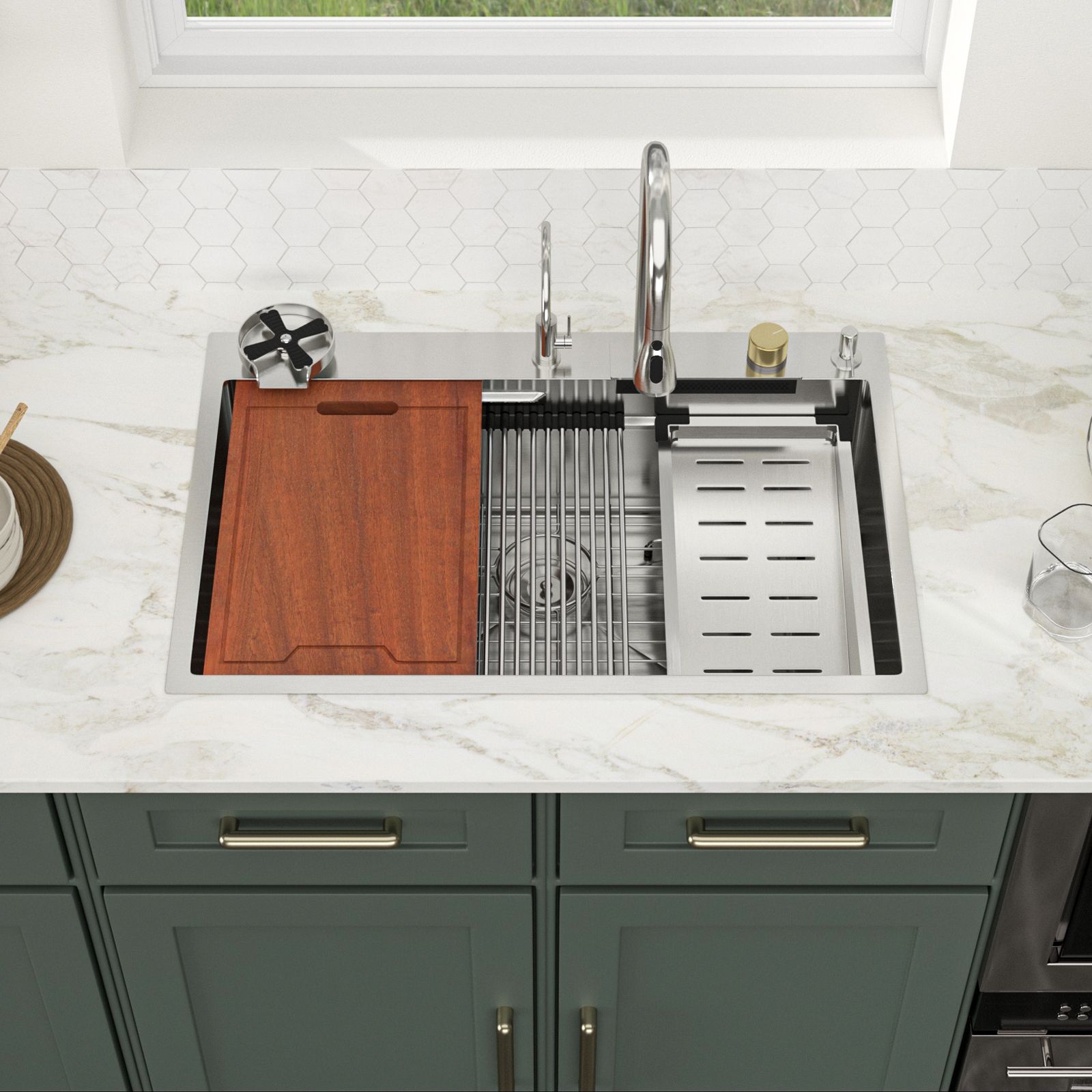 1.This 33-inch drop-in workstation sink constructed by brushed surface stainless steel which combine contemporary exterior design and scratch-resistant properties.