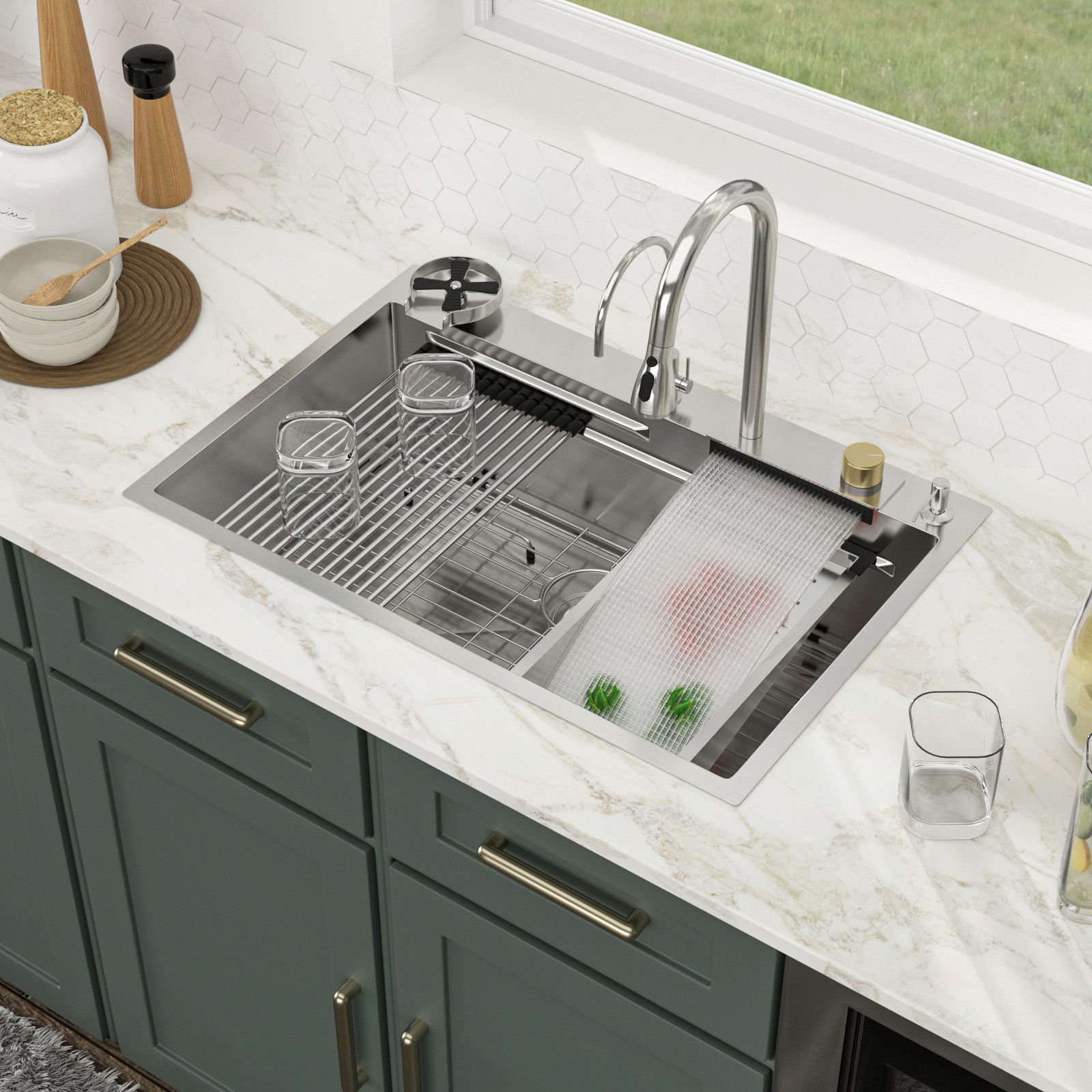 Package include: a top-mount stainless steel kitchen sink, cup washer, pull out  faucet, rolling drying rack, colander, cutting board, drain, bottom grid, mounting hardware and operation instruction.